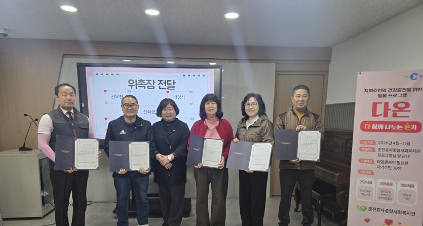 금일 춘천효자종합사회복지관에서는 춘천시 지원의 고향사랑기금 사업인 지역주민의 건강 증진을 위한 돌봄 프로그램 '다온(다 함께 나누는 온기)' 사업 안내 및 마음지기 위촉식이 진행 되었습니다.