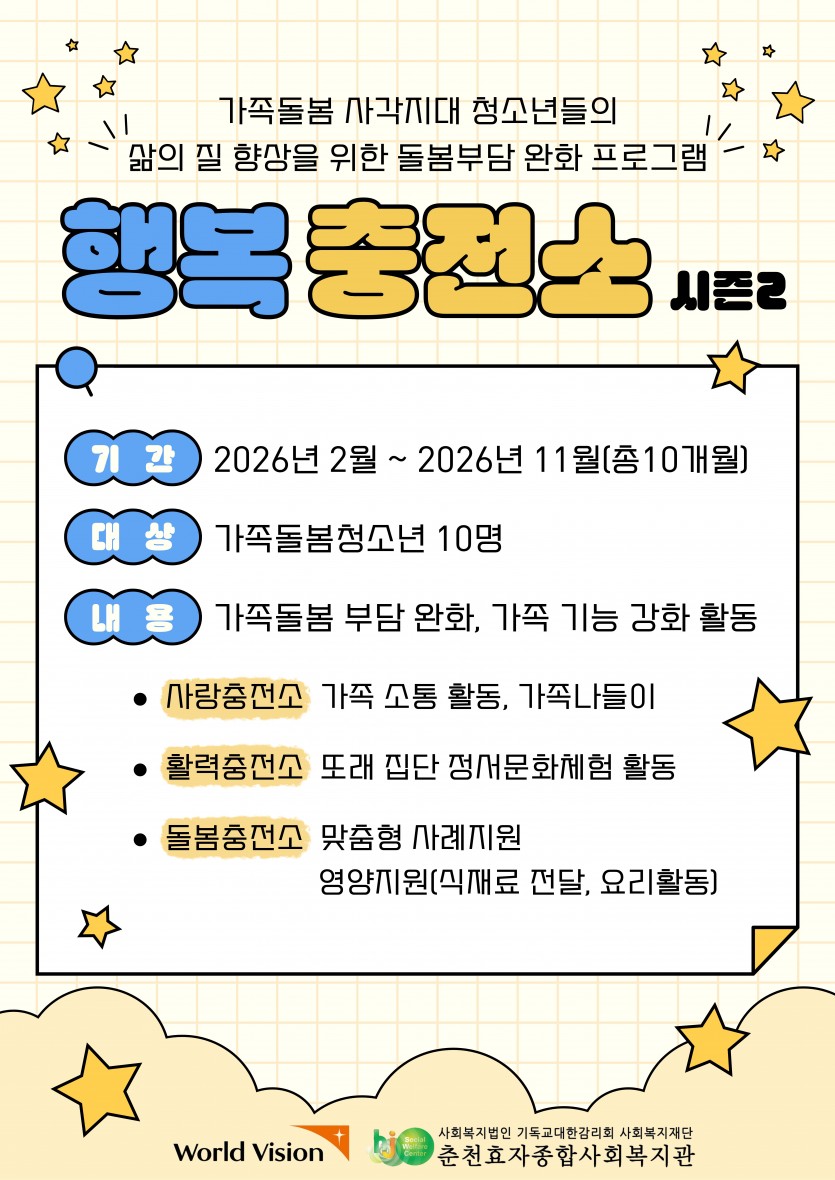 춘천효자종합사회복지관에서는 2025년에 이어 2026년에도 월드비전 지원 가족돌봄 사각지대 청소년들의 삶의 질 향상을 위한 돌봄부담 완화 프로그램 ‘행복충전소 시즌2’가 진행됩니다. 일상 속 부담을 잠시 내려놓고, 또래와 가족과 함께하는 시간을 통해 하루하루를 행복으로 채워갈 수 있도록 다양한 활동을 진행할 예정입니다!