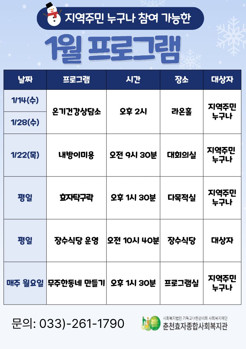 2026년 1월 프로그램 일정표 페이지 정보 작성자 최고관리자 댓글 0건 조회 59회 작성일 25-12-31 15:55 본문 많은 관심과 참여 부탁드립니다. 목록 다음글꿈을 향한 7년의 위대한 여정, 월드비전 꿈꾸는 아이들 <히어로마인드> 참여 아동을 모집합니다!<모집 중> 25.12.30 댓글목록 댓글목록 등록된 댓글이 없습니다.