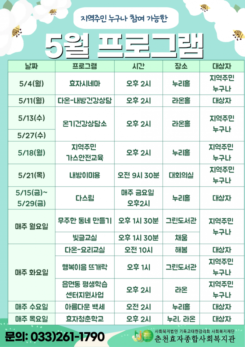2026년 5월 프로그램 일정표 페이지 정보 작성자 최고관리자 댓글 0건 조회 30회 작성일 26-04-22 16:54 본문 많은 관심과 참여 부탁드립니다. 목록 다음글2026년 2차년도 ESG 기획사업 [초록지구, 내가 GREEN 춘천] 어린이환경사랑그림공모전 수상공고 26.04.20 댓글목록 댓글목록 등록된 댓글이 없습니다.