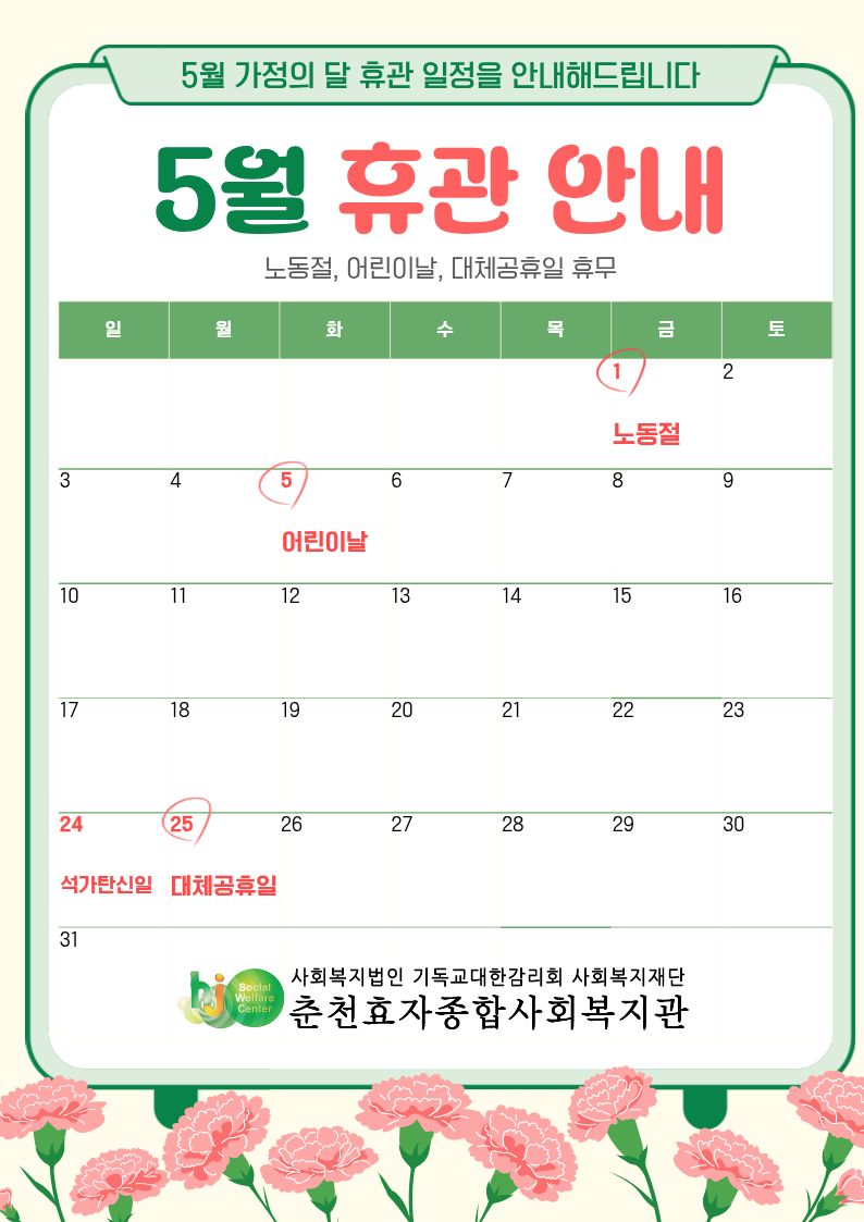 2026년 5월 복지관 휴관 안내 페이지 정보 작성자 최고관리자 댓글 0건 조회 14회 작성일 26-04-29 11:07 본문 5월 1일(노동절), 5월 5일(어린이날), 5월 25일(대체공휴일)은 휴관일입니다.이용에 참고 바라며 평안한 가정의 달을 보내시길 기원 하겠습니다. 목록 이전글2026년 지역주민 가스안전교육 진행 26.04.30 다음글2026년 5월 프로그램 일정표 26.04.22 댓글목록 댓글목록 등록된 댓글이 없습니다.